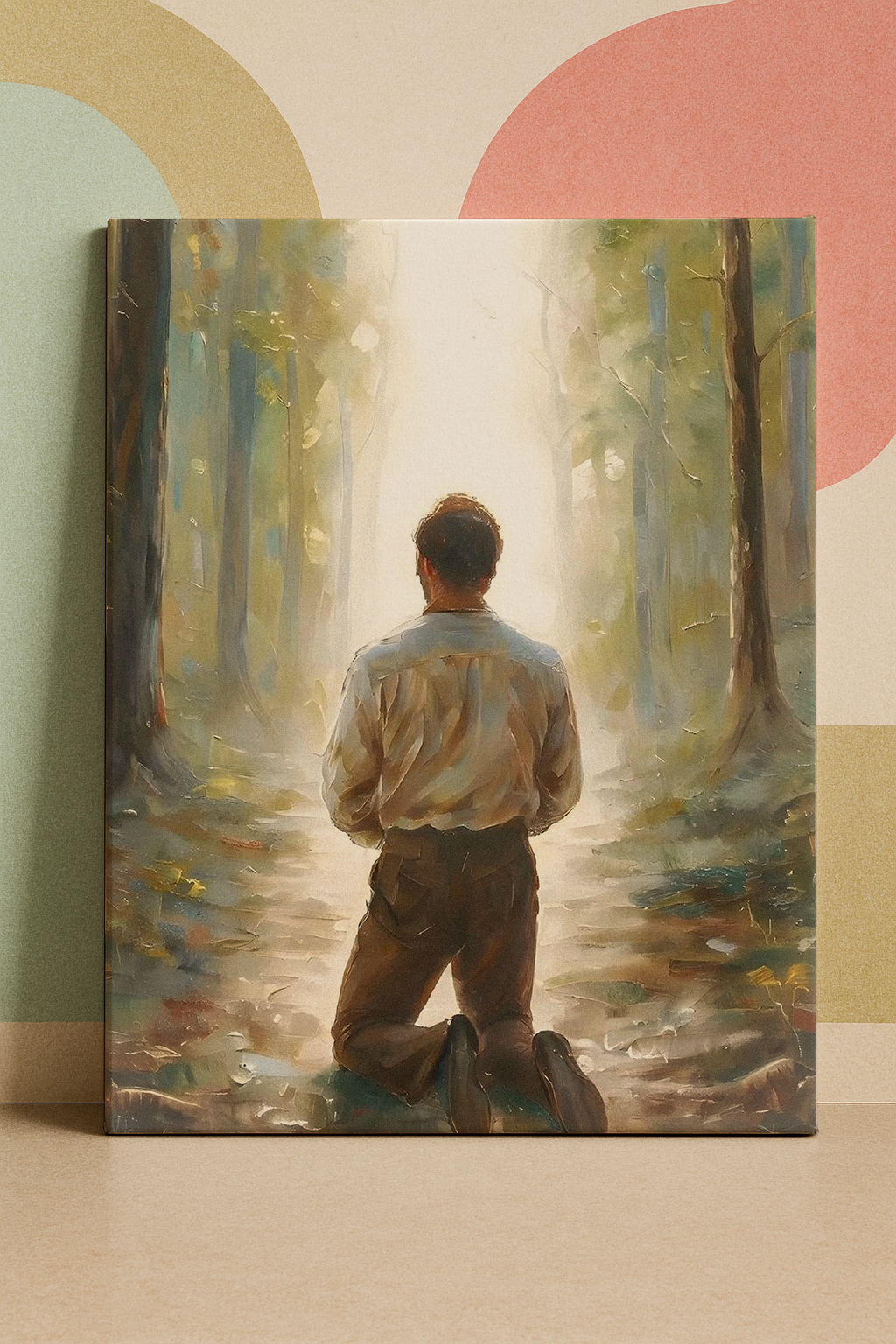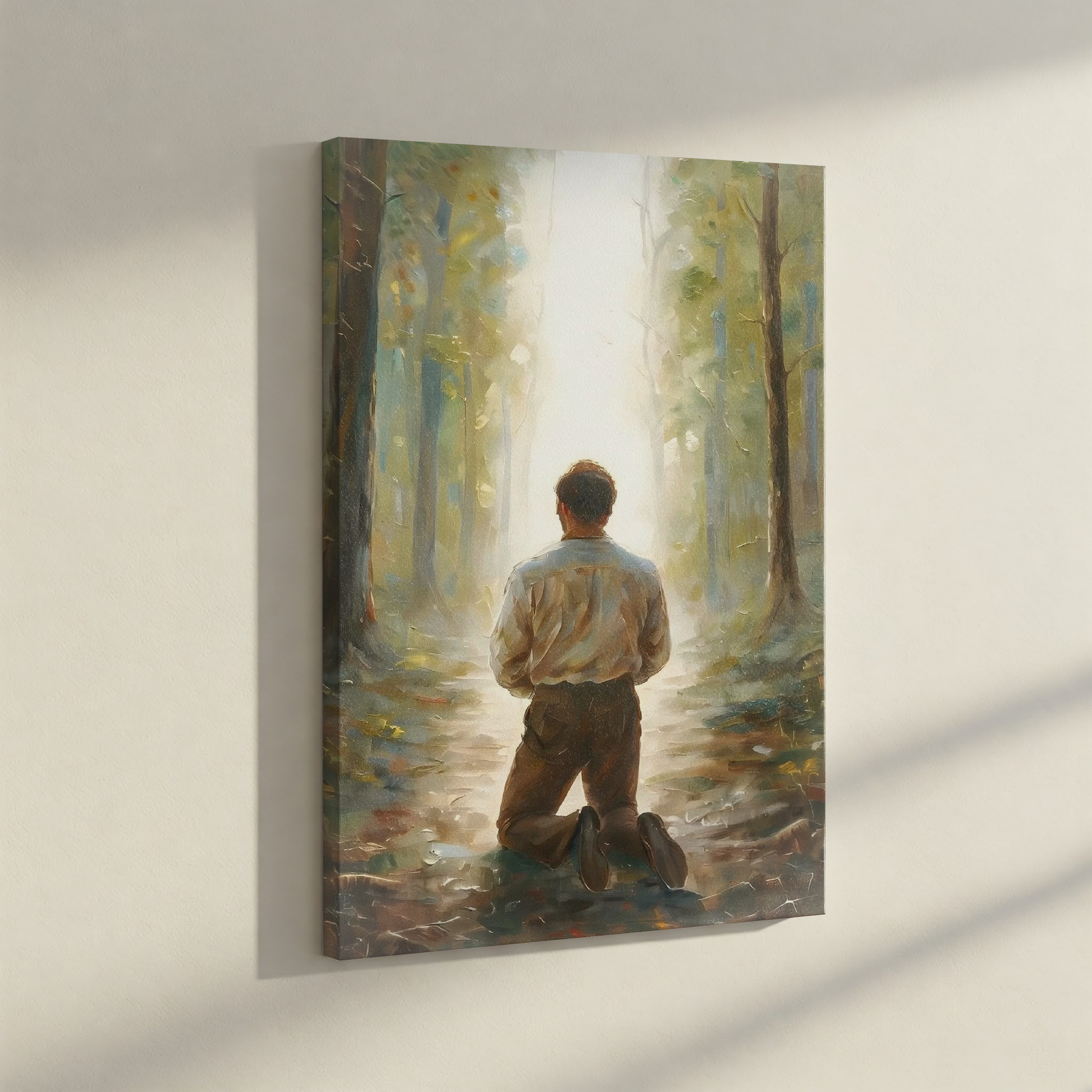 This powerful rendered digital artwork captures the profound moment of Joseph Smith's First Vision in the Sacred Grove. Bathed in an ethereal pillar of light, the scene evokes revelation, spiritual seeking, and the divine connection found in moments of earnest prayer. Its modern, artistic style brings a reflective and inspiring presence to any space.