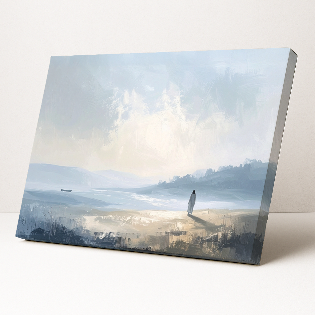 "Still Waters," captures a moment of serene peace and profound quietude. The scene depicts Christ standing at the edge of calm water under a soft, peaceful sky, inviting contemplation and stillness, crafted using modern digital techniques. This is a digital artwork.